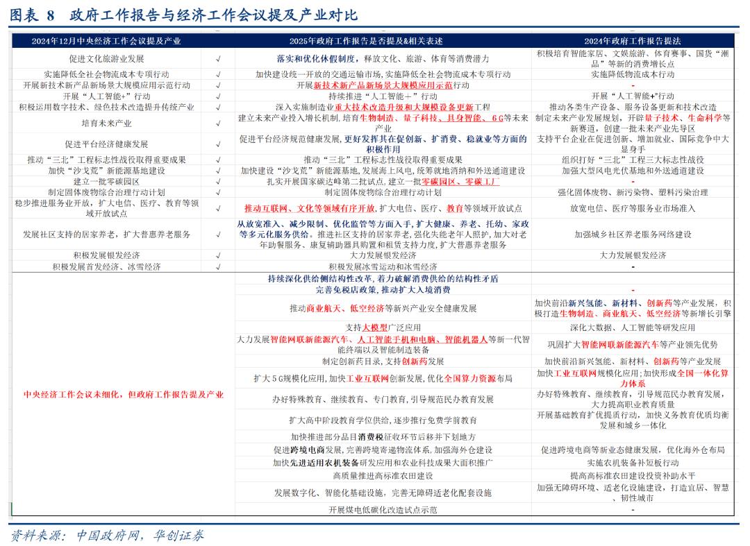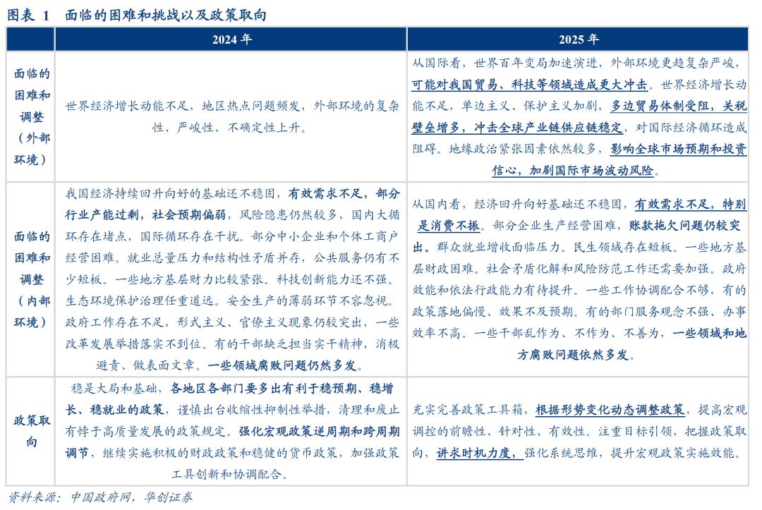 我们对比2024年和2025年政府工作报告的两个地方的表述。一是面临的困难和挑战。二是政策取向。今年的困难和挑战部分对外部环境的描述篇幅大幅增加,字数上去年为40个字,今年为149个字。较为关注外部环境对我国贸易、科技、全球产业链供应链、全球市场预期的冲击。这样的环境之外,相应的政策取向部分更加强调相机抉择。“根据形势变化动态调整政策,把握政策取向,讲求时机力度。”