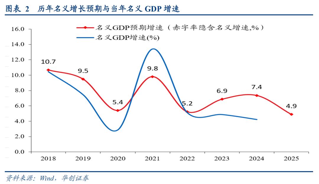 ,此前地方政府工作报告的披露的GDP实际增速目标隐含的全国目标即为5%左右。,根据赤字率、赤字额倒算的名义GDP增速在4.9%左右,低于去年的预期目标7.4%。考虑到2024年名义GDP增速为4.2%,这一增长预期或更加务实,但同样高于名义增速,或也需要进一步调整供求关系。