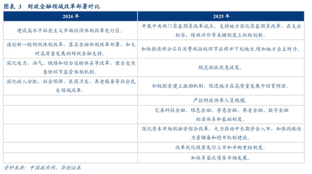 就财政领域而言,政府工作报告细化了9件较为具体的改革内容。包括“零基预算改革”、“部分品目消费税征收环节后移”、“严控财政供养人员规模”、“加强战略性力量储备和稳市机制建设”、“改革优化股票发行上市和并购重组制度”等。