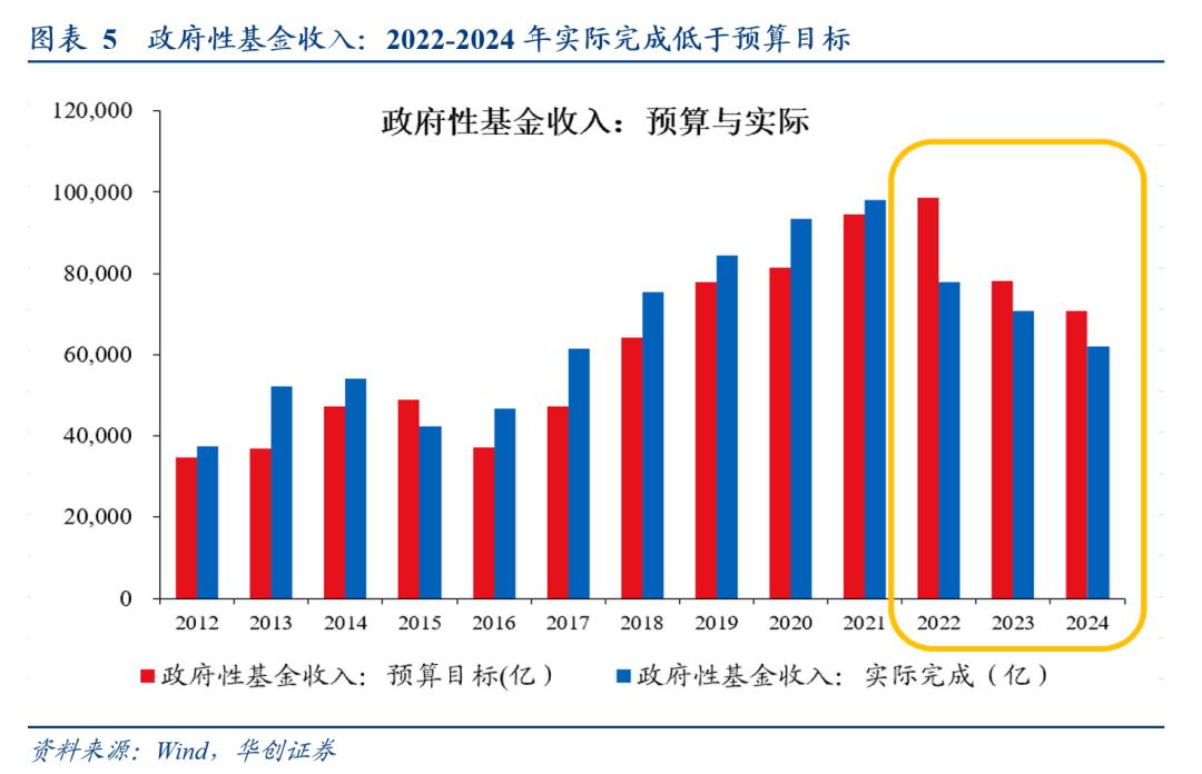 2)政府性基金收入:预期增速为0.7%,但这一增速能否实现,取决于卖地情况能否好转。往年经验来看,土地市场低迷时,实现的收入会低于预算目标。例如2024年,“,下降12.2%,主要是地方国有土地使用权出让收入下降。”