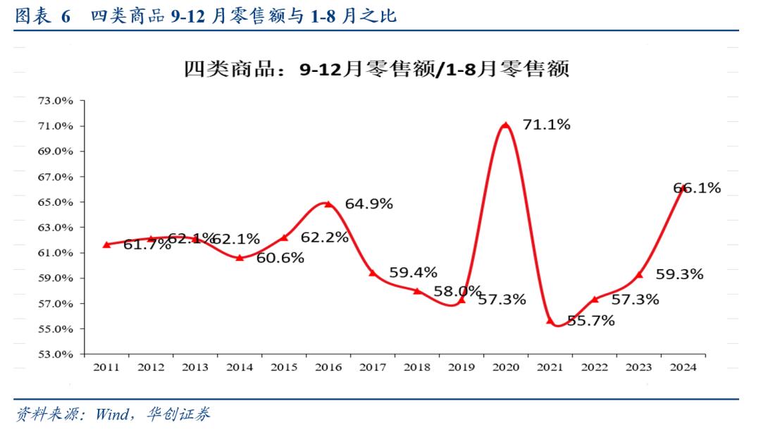 角度一:计算历年汽车、家电、家具、文化办公用品四类商品的零售额与9-12月零售额与前8个月零售额之比,2024年明显偏高,这一偏高的部分可视为政策的增量效果,据此估算,2024年1500亿的消费补贴的乘数可能在1.6倍左右。(注:没有补贴时,假设9-12月零售额与1-8月之比为2011年以来平均值,不含2020年)。