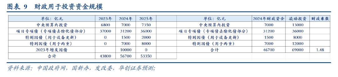 包括中央预算内投资7350亿、项目专项债预计为3.6万亿(4.4万亿的新增专项债用预计有8000亿用于化债)、用于设备更新的特别国债2000亿、用于两重的特别国债8000亿。
