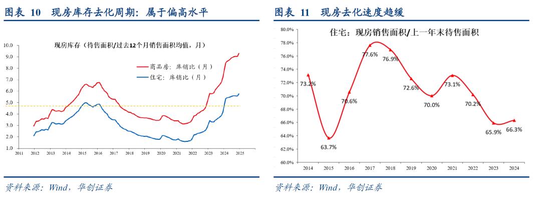 从目前的数据来看,截止至2024年12月末,住宅的未售现房(已竣工未销售)去化周期达到5.76个月,2011年以来新高。以现房消费面积/上年末待售面积衡量的现房去化速度来看,2024年为66.3%,同样处于历史偏低水平。