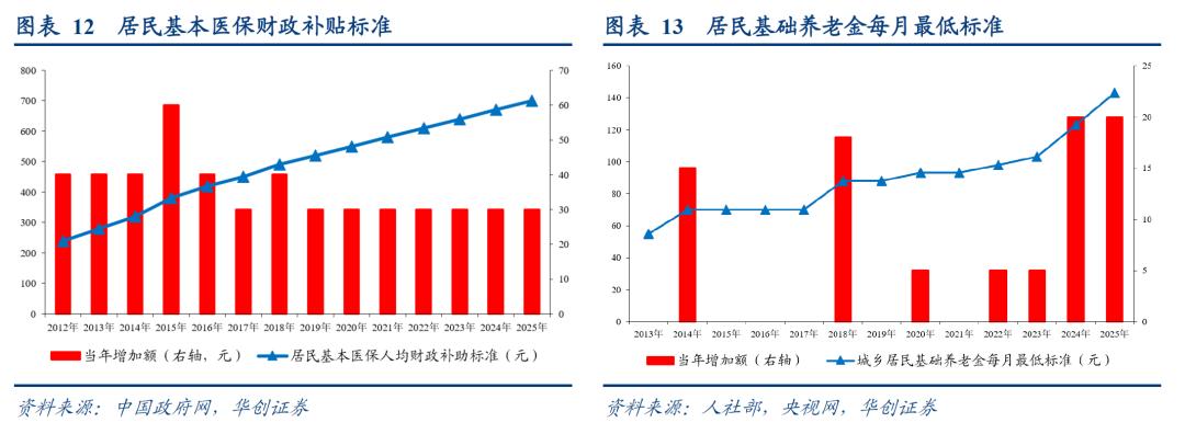 民生保障方面,一方面,继续提高医保和养老金补贴标准,但提高幅度与2024年一致。例如,养老金方面,“城乡居民基础养老金最低标准再提高20元”,根据央视网报道,“近些年,中央财政补贴(即全国基础养老金最低标准)均以定额调整的方式上涨,已从制度建立初期的每人每月55元提高至123元。