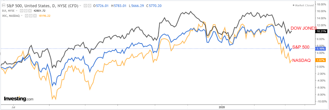英为财情Investing.com - 上周五(7日)美股虽在震荡中收升,但受特朗普贸易相关负面消息影响,主要股指仍录得数月来最大单周跌幅。具体来看,道琼斯工业平均指数周跌2.4%,标普500指数跌3.1%,科技股为主的纳斯达克综合指数跌3.5%。