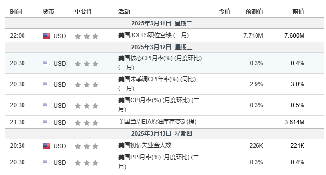 经济数据方面,最受关注的是周三发布的2月美国消费者物价通胀(CPI)报告。如果数据超预期,可能引发市场新一轮动荡。同期还将公布生产者价格指数(PPI),数据将有助于全面了解通胀状况。