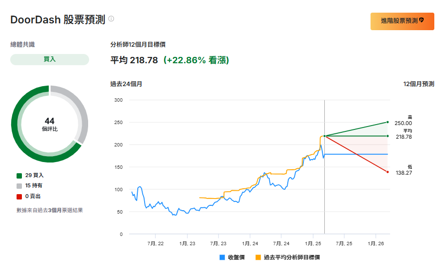 分析师普遍态度乐观,大多给予买入或增持评级,反映出市场对DoorDash的成长前景和市场地位信心充足。