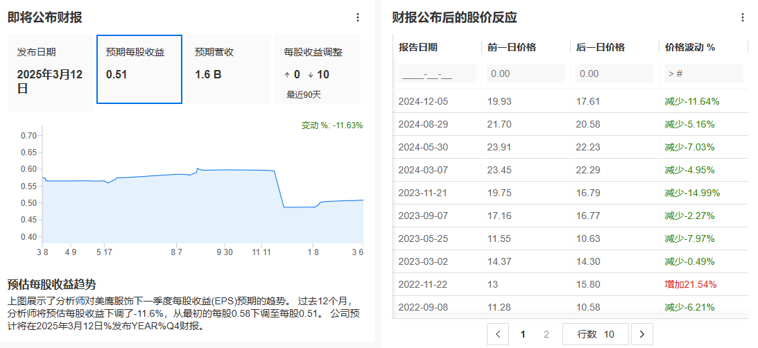 American Eagle财报预测及过往绩后股价波动,来源:InvestingPro