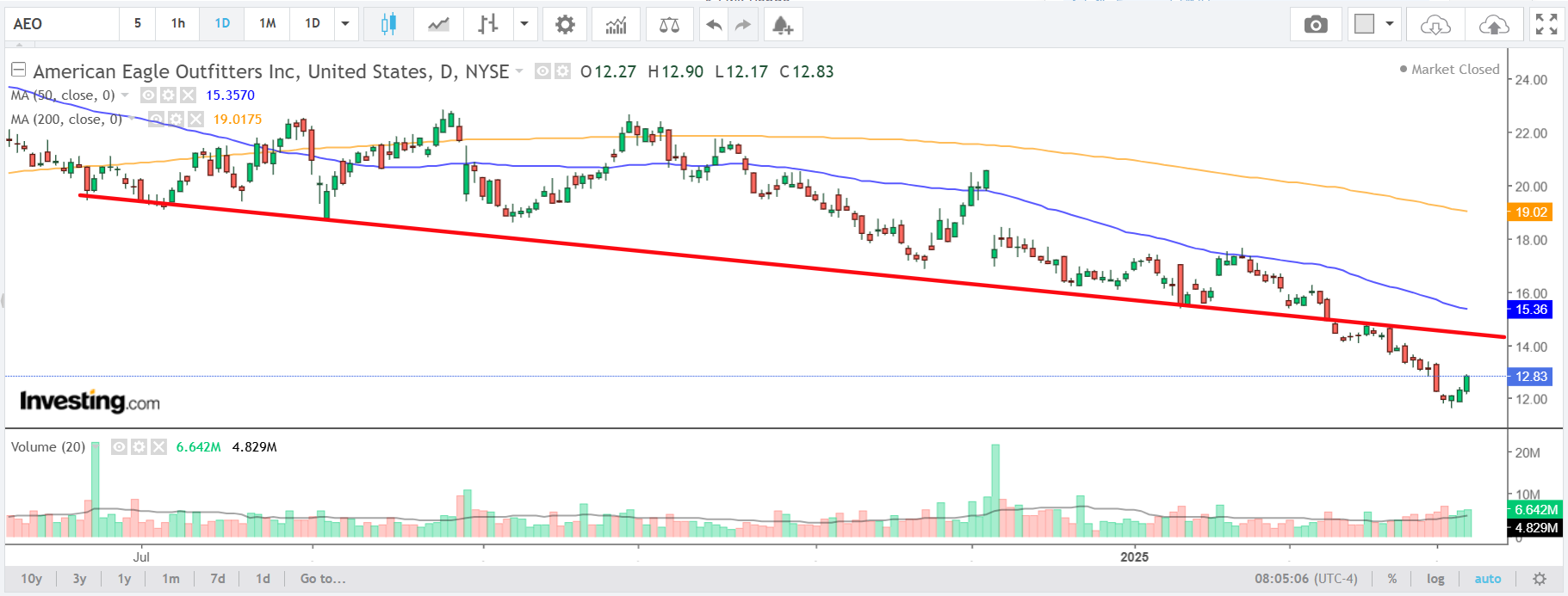 AEO上周五收报12.83美元,接近近期52周低点11.65美元,目前市值25亿美元。股价已跌破主要均线水平,今年以来累计下跌23%。