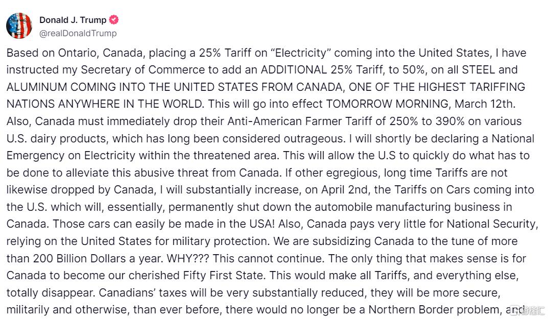 特朗普又出狠招!当地时间周二,特朗普最新宣布,为了回应安省25%输电税,美国将对加拿大钢铝征税再提高25%,使