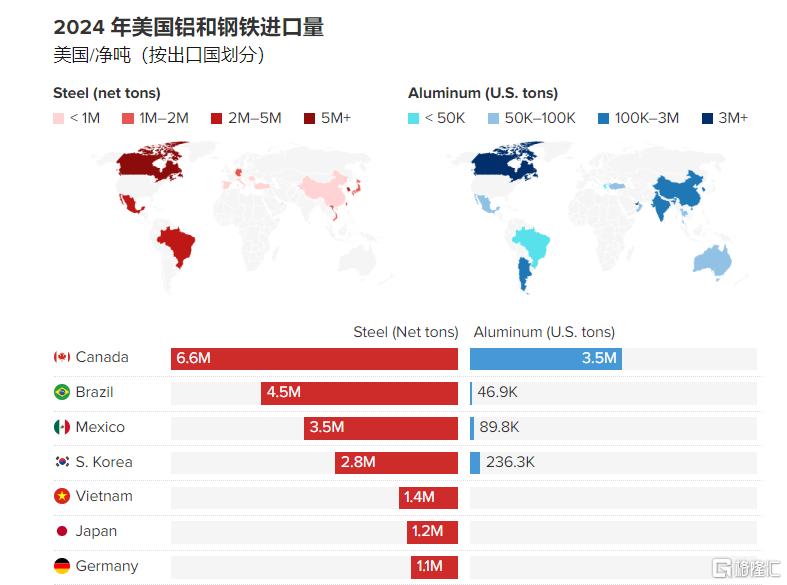 此外2月10日,特朗普又下令对所有输美钢铝征收25%关税,同时取消对部分贸易伙伴的钢铝免税配额和豁免政策。