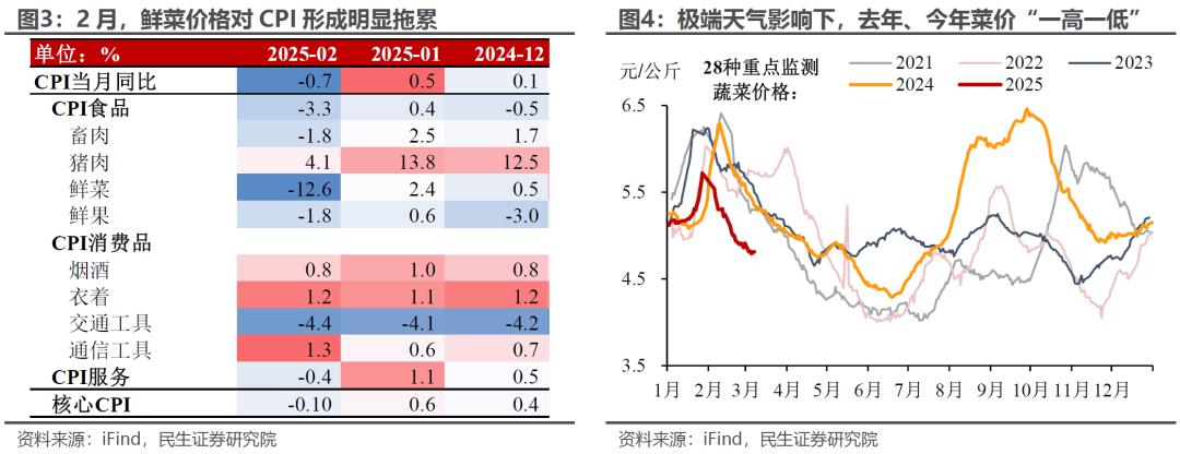 分项来看,2月食品拖累CPI同比下降0.6个百分点,是最大拖累项,其中鲜菜占一半以上、拖累幅度达0.31个百分点。去年2月中下旬,全国多地出现低温、冻雨等极端天气,造成蔬菜价格明显走高。今年2月全国天气条件、鲜菜的生长运输条件较好,鲜菜价格低位运行,