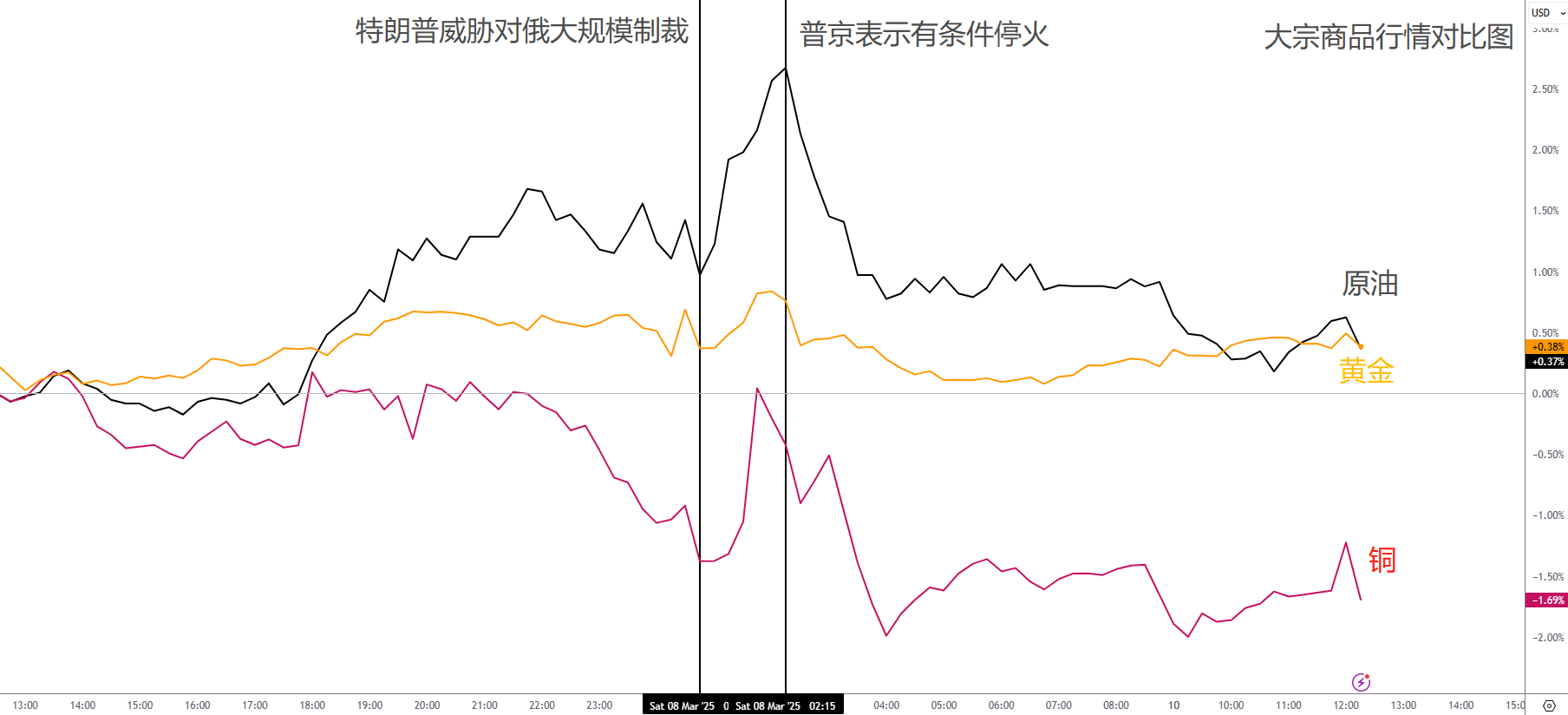 大宗商品市场整体表现震荡。欧盘时段,对欧洲大规模财政的期待,令能源类商品价格上涨。特朗普威胁对俄制裁的情况下,多数商品短时间内同涨。不过普京停火的宣言也让这些商品同步下跌,吐出全部涨幅,并保持震荡走势。