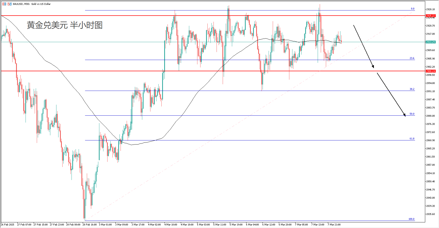 技术面:100均线水平,黄金处在2900-2925的箱体震荡区间,可以考虑在箱体上沿进行逢高做空。不过考虑到中国A股开盘后,金属类大宗商品随股市吐出涨幅,日内的方向偏空,因此更保险的交易策略是等待金价跌破2900后继续跟空。
