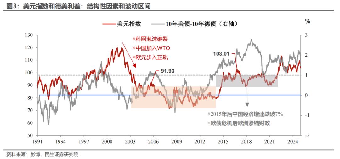 我们倾向于认为如果10年期美德利差能回到100bp之内(当前在140bp左右),美元大概率跌破100;如果10年期美德利差倒挂,美元指数有望跌破90。短期而言这个门槛不低,我们试着从市场定价、叙事演绎和潜在风险进行分析: