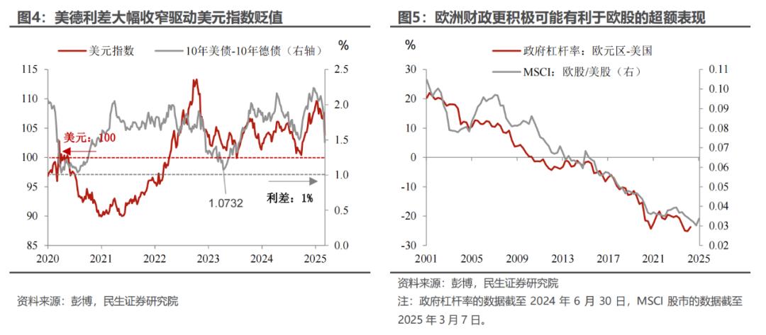 近期宏观逻辑的方向基本如当时报告撰写的“剧本”演绎:美国方面,除了关税上的“摇摆”外,特朗普政府在初期会引导偏紧的财政政策来控通胀和稳利率。非美方面,欧洲的俄乌局势和动荡政局会出现积极信号。当然在“情节”上还是出现了“意外”,其中最出乎意料的可能就是近期俄乌冲突的进展——。