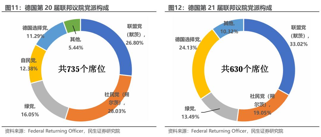 比较尴尬的是该党团在新一届联邦议院中席位占比,将由之前的超过70%,减少至不及2/3(图8至9)。根据德国基本法,大选后30天内新议院需要召开首次会议,这意味着:如果绿党不“反水”,预计成立基建基金和国防预算修宪的诉求能够成功落地,但3月之后继续推进其他扩张诉求的难度会明显上升。
