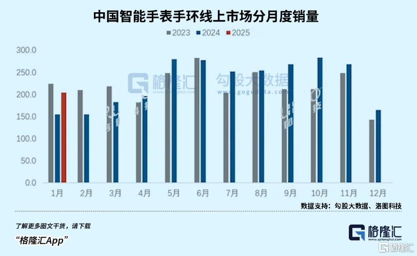 数据显示,1月线上监测智能手表手环市场销量达204.2万台,同比增长31.6%,环比增长23.5%。