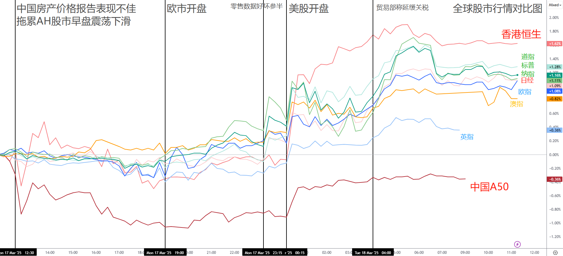 中国AH股市:早盘受到糟糕的房产价格报告影响表现差劲。不过美股一开盘,中概股集体飙升,香港恒生指数弯道超车,收盘表现最佳。A50指数也触底反弹,收回了部分早盘跌幅。