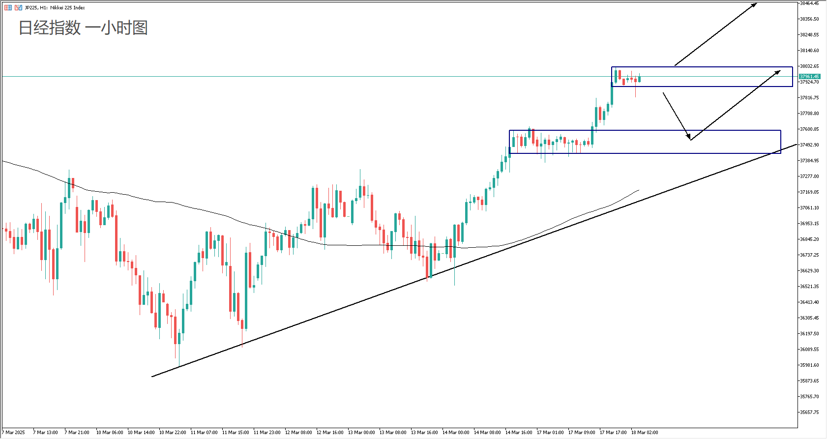 技术面: 100均线向上,多头动能强劲。自从上周五美股反弹开始,日经的动能比美股更强。日内交易策略应该是以静区突破跟随为主。如果指数向下跌破37900价格静区,则需要等待指数回调至37500,再行入场多单。目标位置可以看趋势线和斐波那契回调线的共同支撑。