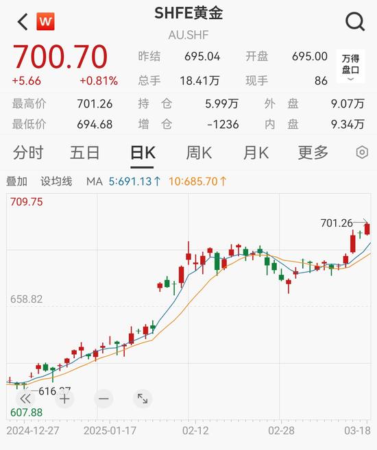 3月18日,国内沪金期货主力合约突破700元/克,伦敦黄金现货最高报3034.34美元/盎司,续创历史新高;COMEX黄金期货价格最高触及3047.5美元/盎司。