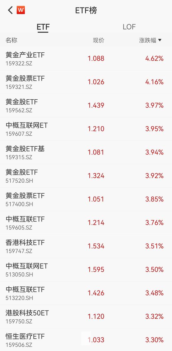 涨幅居前的主题类ETF中,前3位均为黄金类ETF。平安中证沪深港黄金产业股票ETF(159322.SZ)、华安中证沪深港黄金产业股票ETF(159321.SZ)分别上涨4.62%和4.16%,位居涨幅榜前二。