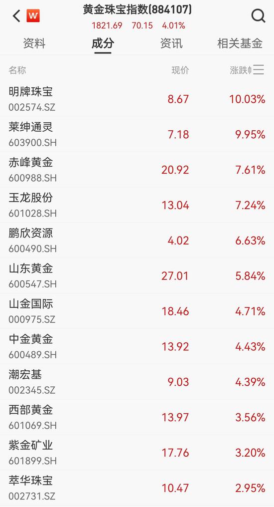 个股方面,3月18日,黄金珠宝指数上涨4.01%,领涨两市,明牌珠宝、莱绅通灵涨停;赤峰黄金、玉龙股份、鹏欣资源、山东黄金等涨幅居前。