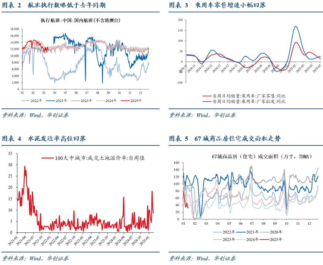 :1)电影票房:3月9日当周电影票房5.9亿元,同比为-28%,相比9月29日当周的-86%上行58个百分点;2)沥青装置开工率:2月13日至3月12日的石油沥青开工率四周均值为27.4%,相比8月29日-9月25日四周的均值26.0%上行1.4个百分点;3)商品房成交面积:3月9日当周商品房成交面积同比为16%,相比9月29日当周的-24%上行40个百分点;4)乘用车批零:3月9日当周乘用车批零增速20%,相比9月30日当周的-18%上行38个百分点。