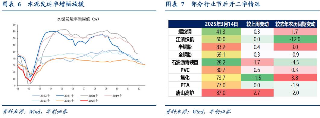 截至3月12日当周,石油沥青装置开工率为28.2%,环比上周回升1.7个点,较去年农历同期低约4个百分点。截至3月7日当周,水泥发运率为30%,环比上周增长约2.5个点,接近去年农历同期,但弱于2021-2023年同期。