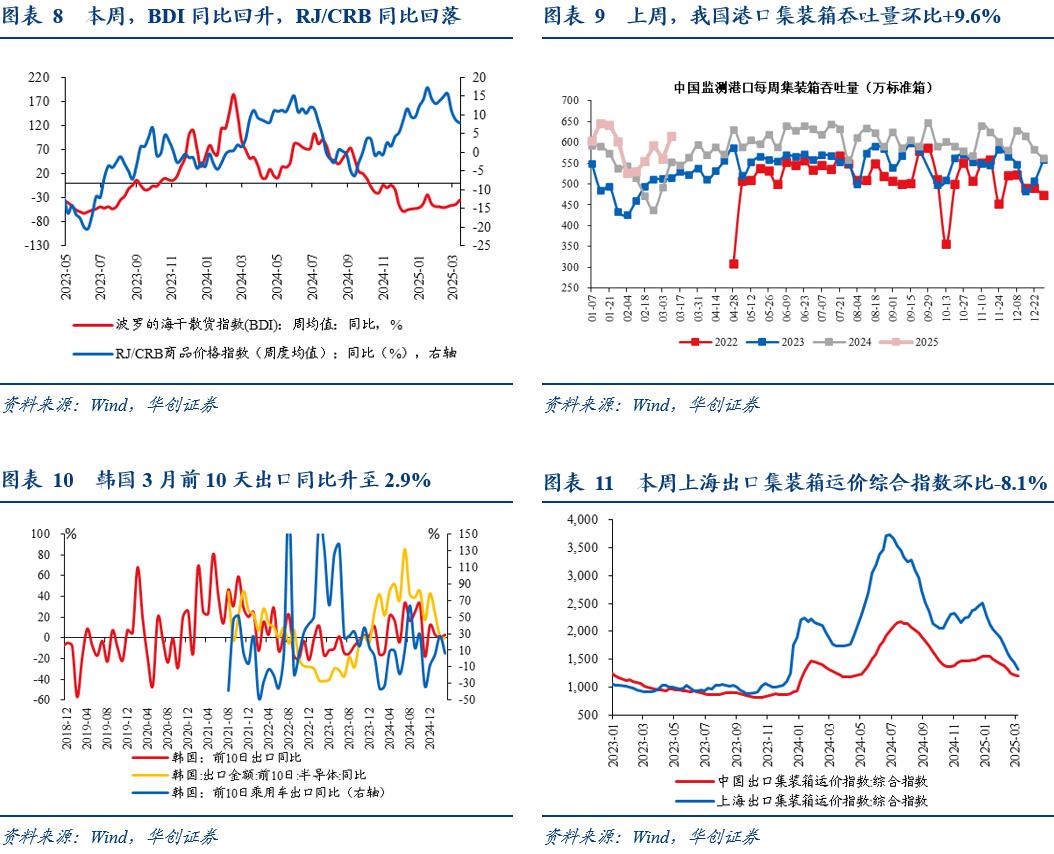 :3月14日当周,BDI同比回升至-34.4%%,前值43.2%。。3月14日当周,RJ/CRB同比降至7.8%,前值8.7%。3月前10天出口同比回升至2.9%,2月为0.5%,1-2月平均为1.9%。