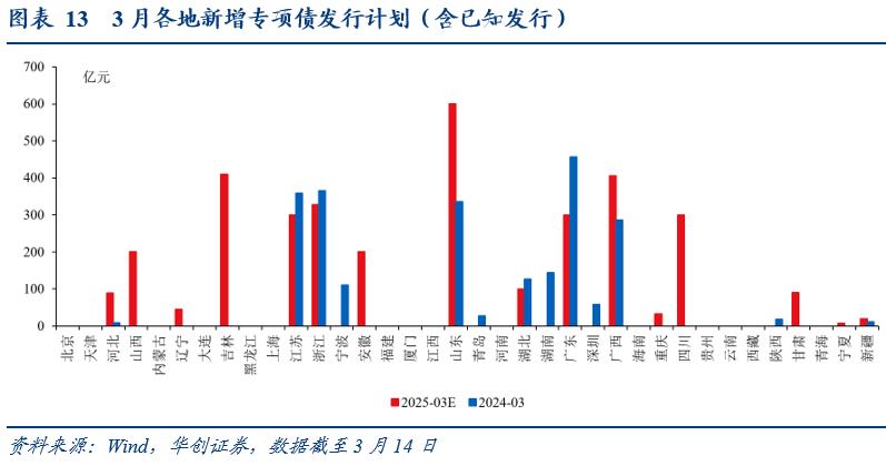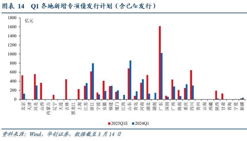 截至3月14日,河北、山西、江苏、浙江、宁波、安徽、福建、厦门、山东、湖北、湖南、深圳、海南、重庆、四川、贵州、云南、甘肃、辽宁、江西、广西、青岛、宁夏、陕西、广东、北京、吉林等27个地方披露了2025年3月/Q1地方债发行计划(含已知发行),其中新增专项债发行计划已披露3428亿/9396亿(2024年同期,已披露地区实际发行2288亿/5580亿)。