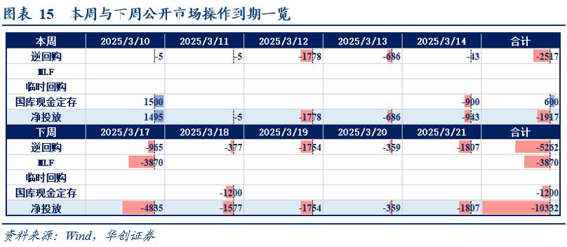 截至3月14日,DR001收于1.8001%,DR007收于1.8121%,R007收于1.8312%,较3月7日环比分别变化+0.6bps、+0.55bps、+2.05bps。本周央行逆回购净回笼资金2517亿,下周逆回购+MLF到期资金9132亿。