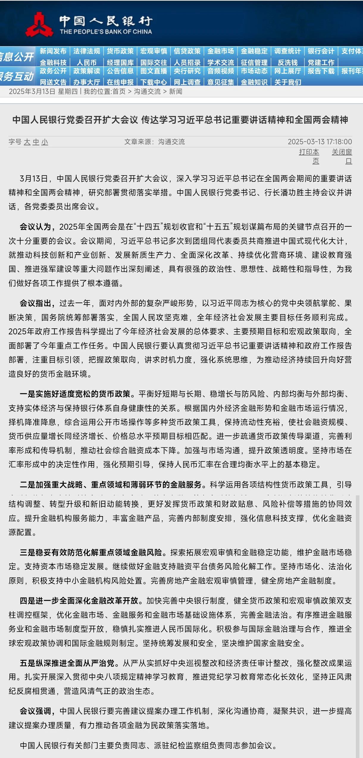 3月13日,中国人民银行党委召开扩大会议,深入学习全国两会精神,研究部署贯彻落实举措。中国人民银行党委书记、行长潘功胜主持会议并讲话,各党委委员出席会议。