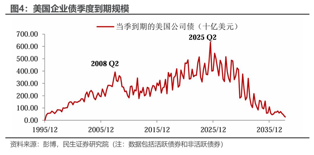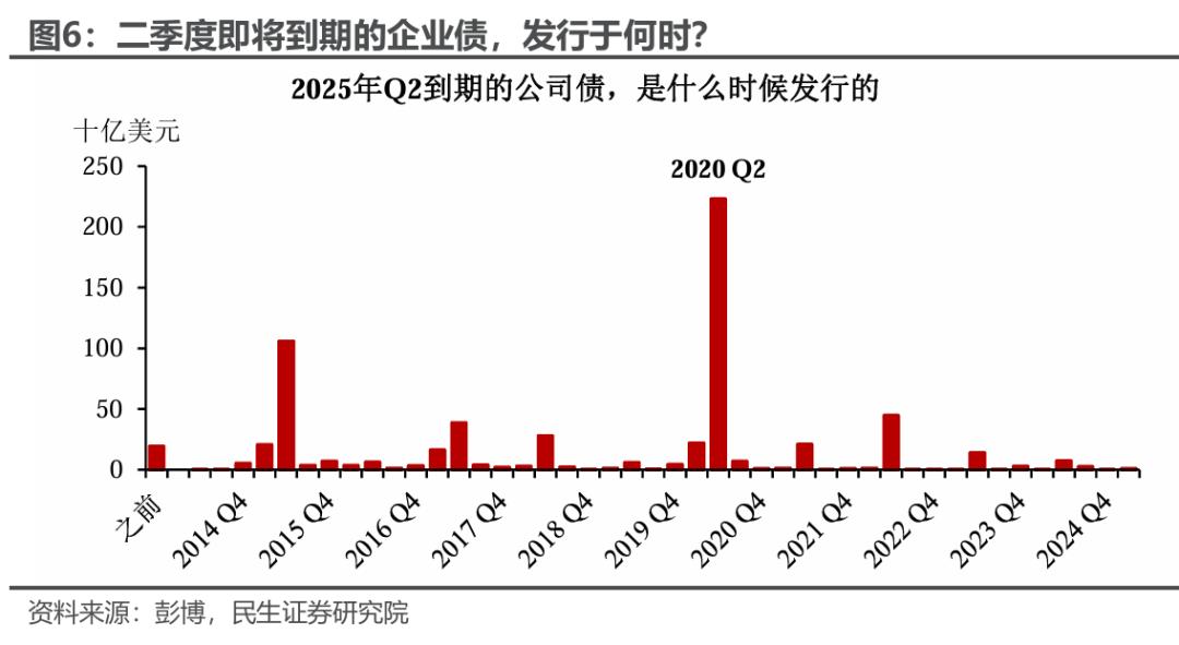 根据彭博数据,如果不考虑提前偿还,2025年二季度应到期偿还的企业债将超过6千亿美元(图4),对应了2020年企业债史无前例的发行高峰,规模较2024下半年两季度平均值上升70%。二季度即将到期的公司债超一半发行于2020 Q2和2015 Q2。我们估算,