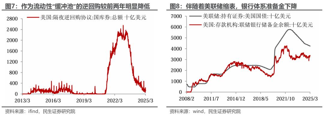 作为流动性“缓冲池”的美联储隔夜逆回购(ONRRP)已较前两年大幅降低;伴随美联储持续缩表(QT),商业银行体系的超储也明显减少,随称不上紧张,但也难言宽松。