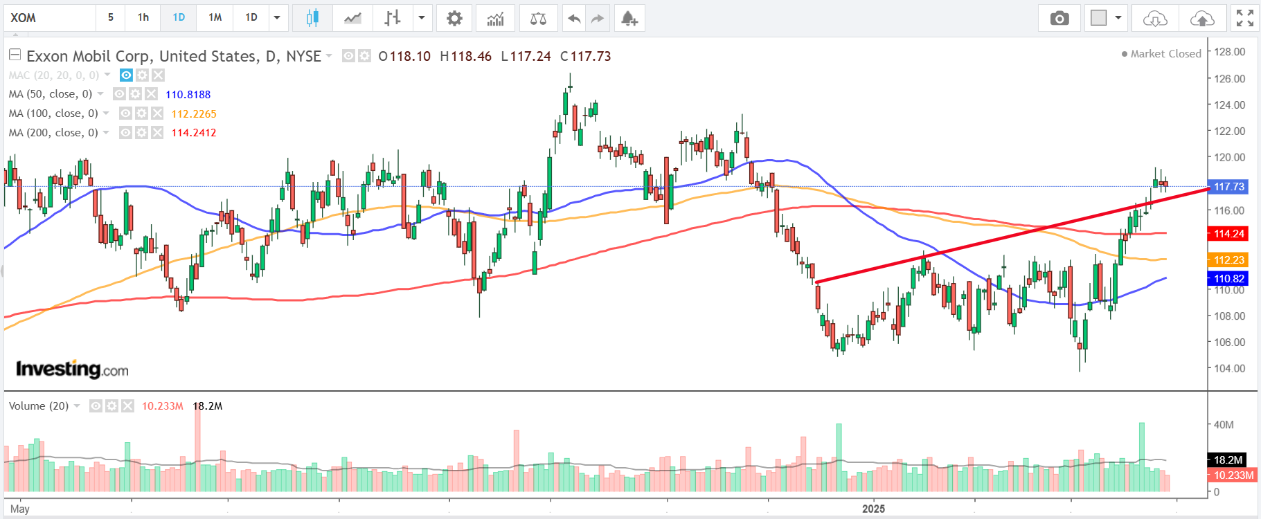 埃克森美孚股价走势图,来源:英为财情Investing.com