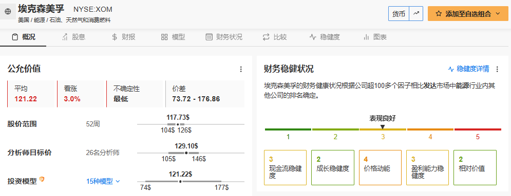埃克森美孚估值及稳健度数据,来源:InvestingPro