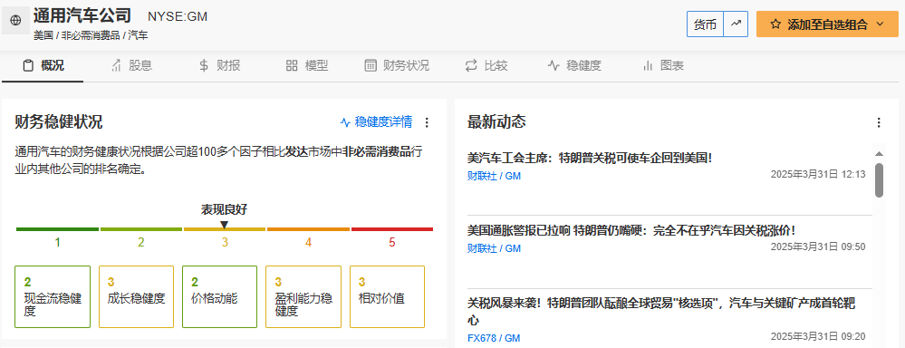 整体而言,通用汽车的财务稳健度评分为2.61,获得「良好」评级。通用汽车在盈利指标(2.76)和增长(2.75)方面表现平稳,但现金流(2.03)和价格动能(2.29)则略显疲弱。