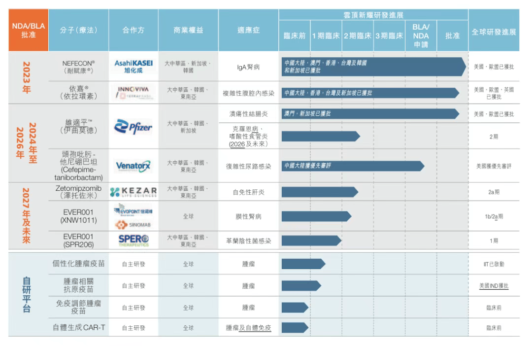 云顶新耀在肾脏、抗感染和自身免疫性疾病领域建立了强大的产品管线,包括疾病首创或同类最佳资产。这些项目涵盖短期、中期及长期机会,预计将为公司带来显著的收入增长。下表为其主要产品管线及各候选药物及疫苗的研发进展状况: