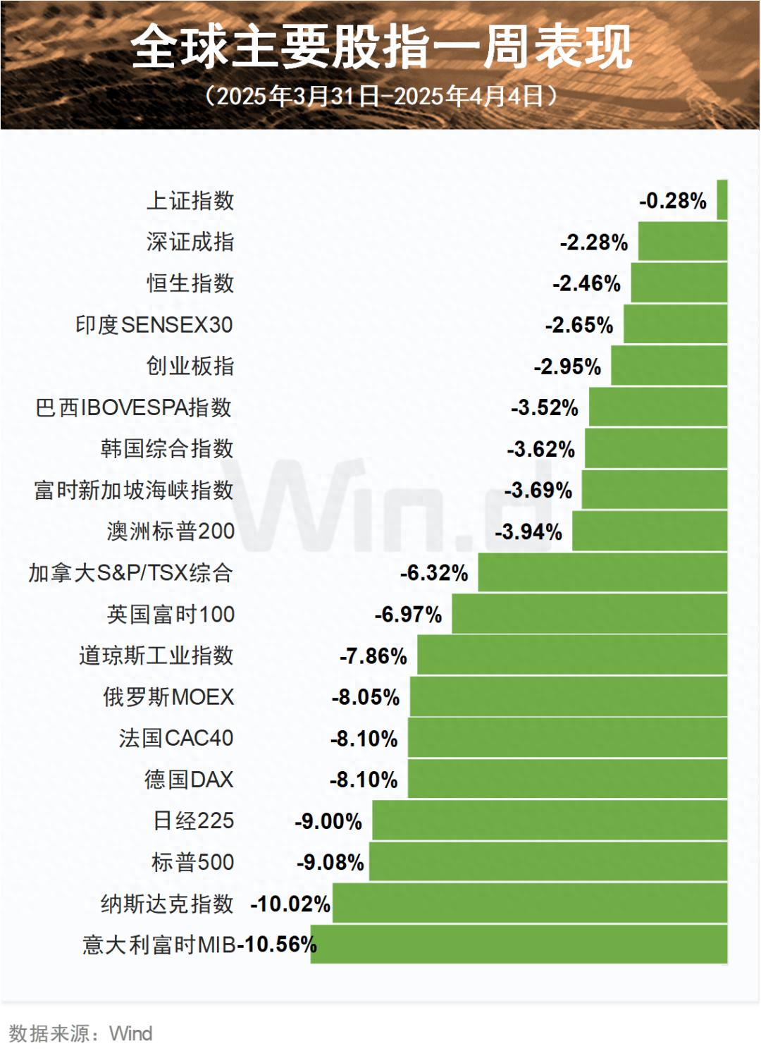 过去一周,受美国关税政策影响,全球多数股市经历了重挫。Wind数据显示,全球主要经济体19个股指全部下跌,其中意大利富时MIB、纳斯达克综合指数跌幅最大,单周累计下挫超过10%。紧随其后标普500、日经225、德国DAX、法国CAC40等8个股指周跌幅超过5%。而中国A股上证指数最抗跌,一周仅微幅回落0.28%。