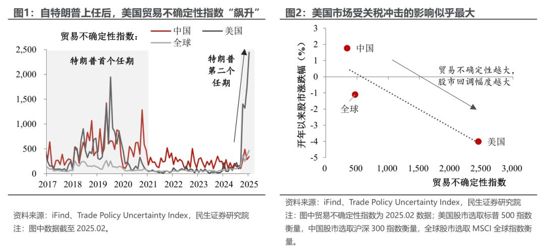 随着特朗普“对等关税”即将揭晓,年初以来关税不确定性对市场的冲击也将进入一个新的阶段。我们认为下一阶段市场演绎的逻辑,仍在于关税冲击下主要经济体所面临的贸易不确定性的大小。如图1所示,在目前这个阶段,由于贸易不确定性上美国>全球>中国,因此美股相对全球和中国股市跑输,美元也表现疲软。从这点来看,今夜的剧本关键在于何种方式和力度的关税美国可以承受,以及中国、欧洲、东南亚等其他对美顺差国谁更难承受。