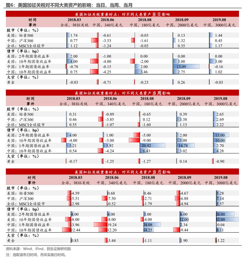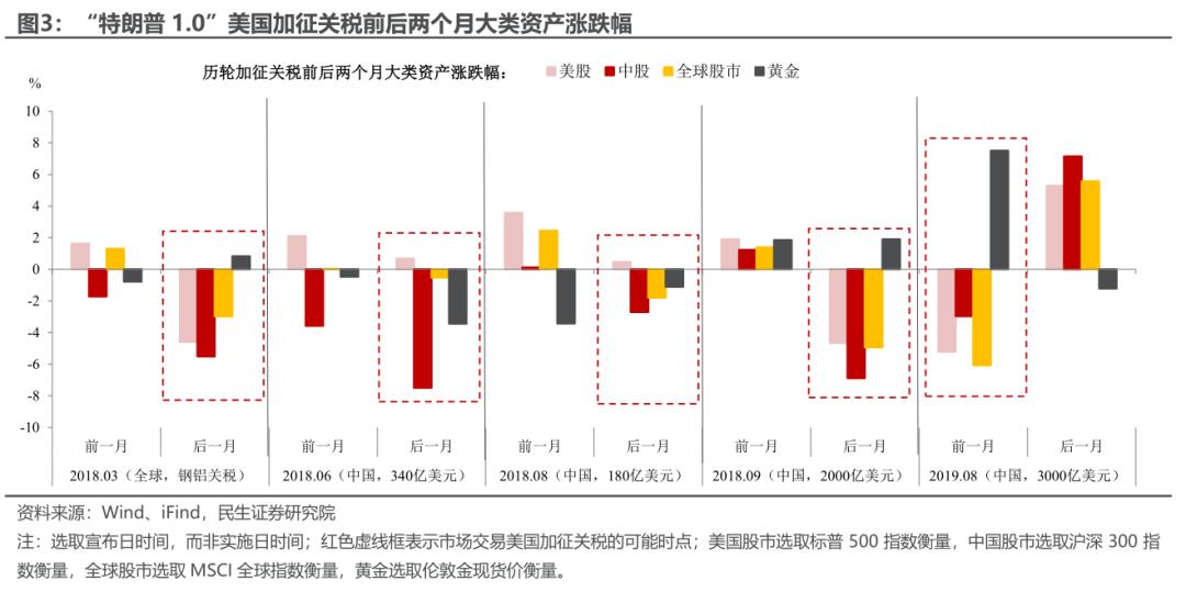 一是看市场有没有提前“消化”关税政策,或者说关税政策是否超预期,比如2018年3月美国政府对全球加征钢铝关税、6月对中国加征340亿美元关税、9月又加征2000亿美元关税后,市场的反应都比较大(尤其是中国股市下跌态势明显)。而随着关税政策的接连落地,市场开始学会“提前定价”:2019年8月美国3000亿美元的关税计划正式“官宣”前,中美、全球股市均在下跌,黄金大涨;“官宣”后,部分清单的推迟使得股市转涨,黄金转跌。