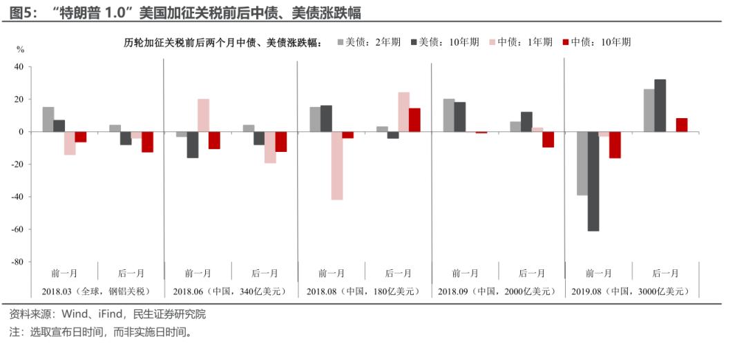 不过,除了关税,债市反应还要考虑利率周期的影响。以美债来说,前几轮美国加征关税均处于美国加息周期,短期内关税引发市场对经济下行的担忧、导致美债收益率短期走弱(尤其是反映经济预期的10年期美债收益率相对于2年期跌幅更加明显),但不改美债收益率长期趋势上行。然而2019年8月的最后一轮加征关税处于美国降息周期,当时市场主要“抢跑”降息预期。