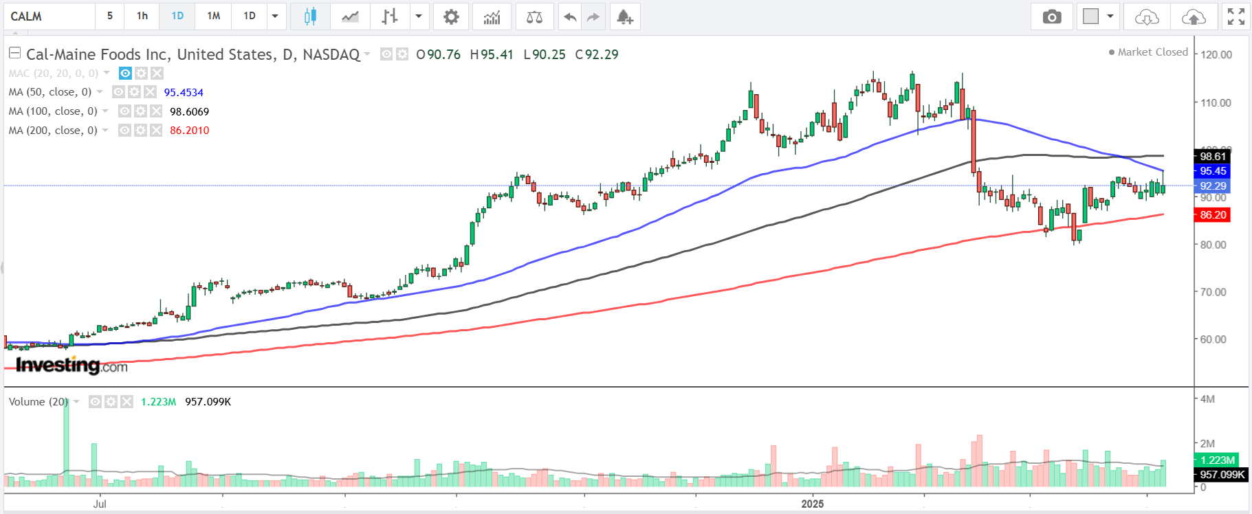 CALM股价上周五(4日)收报92.29美元,现正挑战两个月来区间整理的阻力位。如业绩理想,股价可望突破目前水平。
