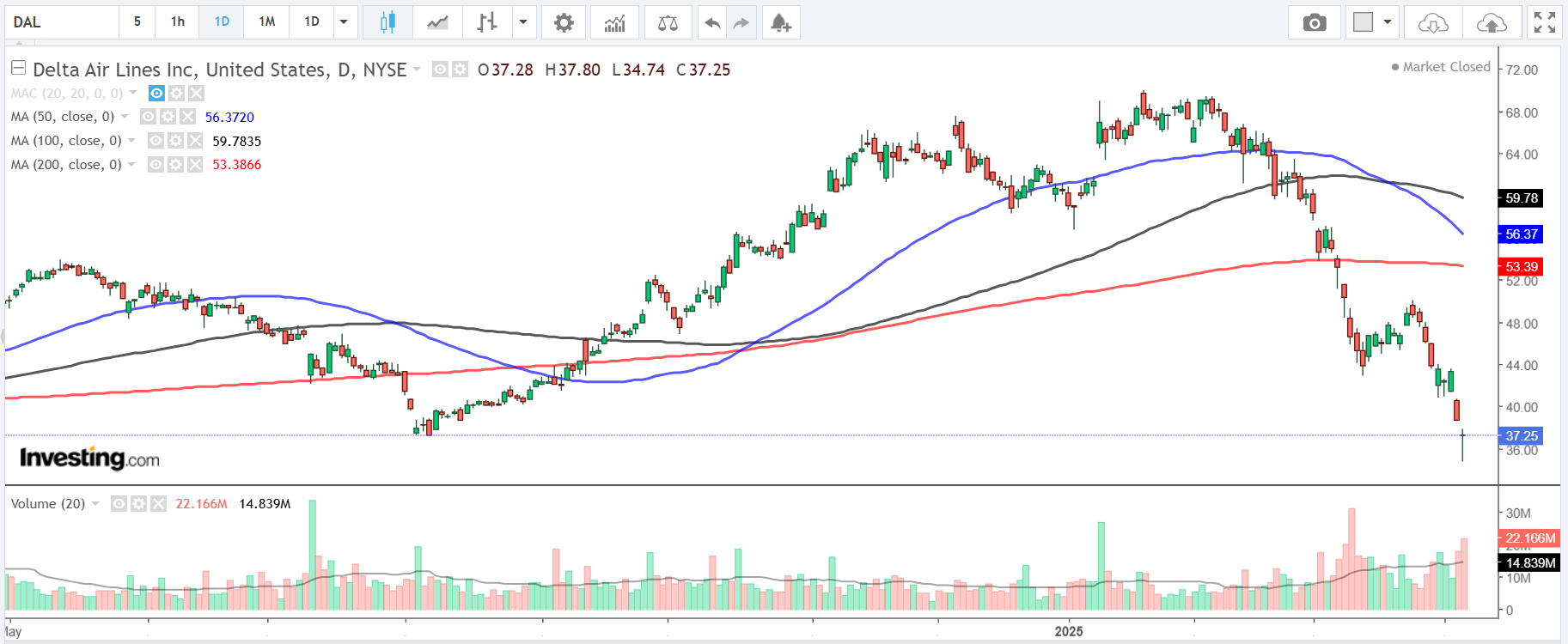 达美航空股价上周五曾跌穿35美元关口,创去年底以来新低,收报37.25美元。达美航空目前市值239亿美元,仍居全球航空业之首。但今年迄今股价已重挫38.4%,且跌破多条关键均线。