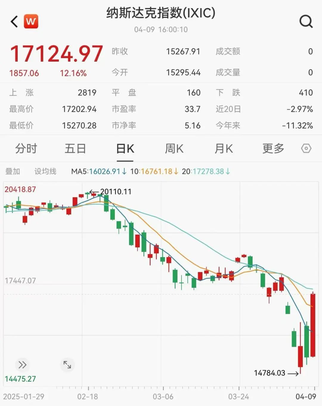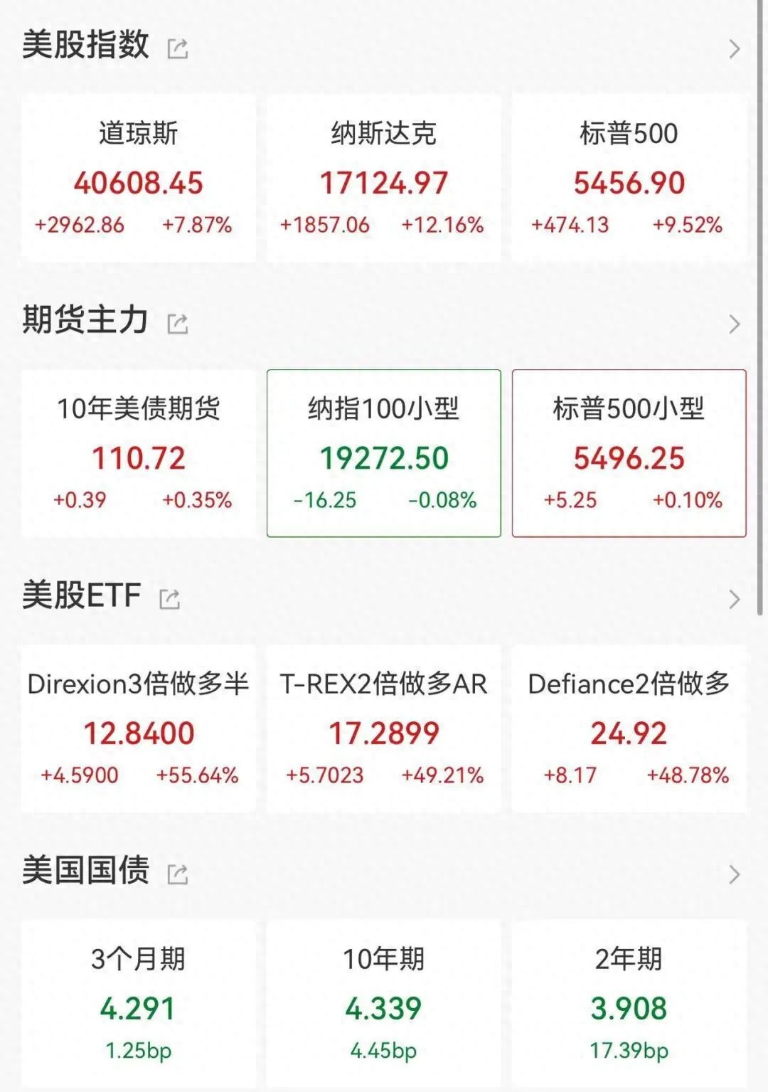 在这场利好刺激下,美国标准普尔500指数暴涨9.52%,收报5456.90点,创下2008年金融危机以来最大单日涨幅。道琼斯工业平均指数飙升2962.86点,涨幅达7.87%,收于40608.45点,为2020年3月以来最大涨幅。纳斯达克综合指数更是狂飙12.16%,收于17124.97点,创下2001年1月以来的最大单日涨幅,并成为历史第二大涨幅日。