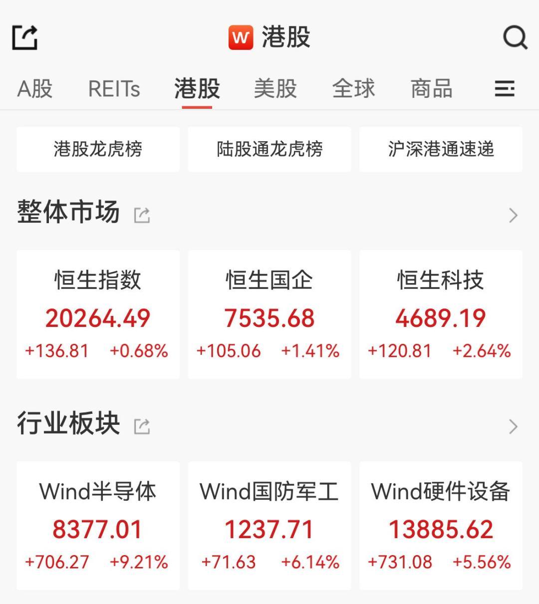 恒指低开高走收涨0.68%,恒生科技指数涨2.64%,南向资金净买入超355亿港元创新高。中芯国际涨超10%,小米集团涨近8%,中国中免放量大涨近24%。