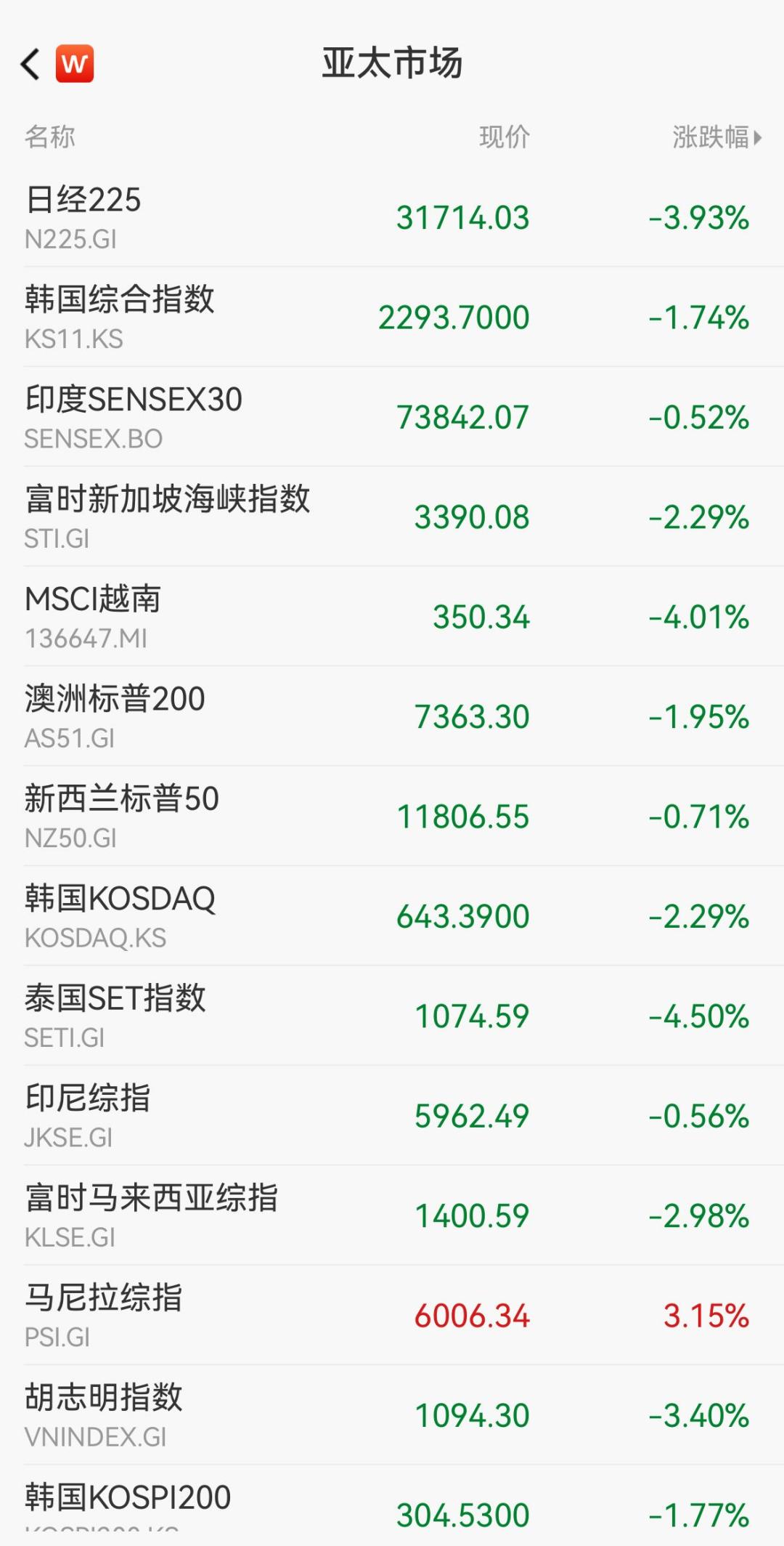 与此同时,经225指数收盘跌3.93%,韩国综合指数收盘跌1.74%,澳洲标普200指数收盘跌1.95%,新西兰标普50指数收盘跌0.71%。