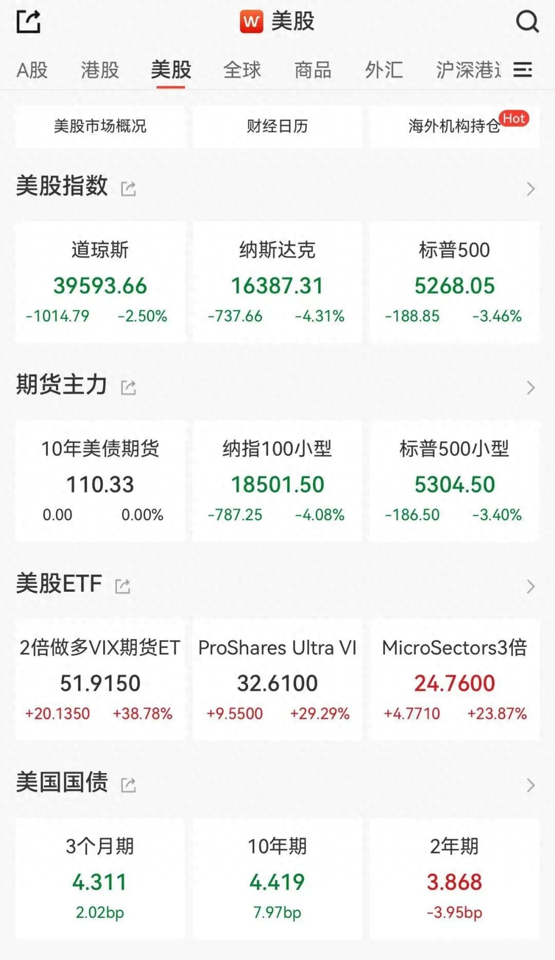 美股周四再度下跌,美国标准普尔500指数下跌3.46%,收于5268.05点;纳斯达克综合指数大跌4.31%,收报16387.31点;道琼斯工业平均指数则下挫1014.79点,跌幅达2.5%,最终报收于39593.66点。科技巨头领跌,特斯拉 (NASDAQ:TSLA)暴跌7.3%,Meta Platforms Inc (NASDAQ:META)平台下跌近7%,英伟达公司 (NASDAQ:NVDA)回落约6%,苹果 (NASDAQ:AAPL)也下滑4.2%。