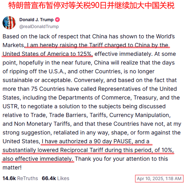 美国股市:美股经历了4月3日与4月4日屠杀级别似的下跌而惊魂未定时,在特朗普宣布暂停对等关税90天后,这在一度程度上缓解了投资者对美国贸易政策对全球经济影响的担忧,市场闻讯瞬间大涨,其中标普500指数终场收涨9.52%,创下2008年以来的最大单日涨幅,这同时也是第二次世界大战以来的第三大涨幅。这次的政策急转弯引发市场不同的声音,有的认为这是特朗普”交易的艺术”,最终目的是对于所有贸易对手国课征10%关税,透过这一番操作,大家反而对于只有10%的关税感恩戴德;有的则是认为特朗普基本上就是个没有诚信的人,随时可以推翻之前所说过的话,这次也是受迫于各方压力,才把对等关税措施延后90天,当前就市场走势的反应来看,有机回朝第一种迈进。